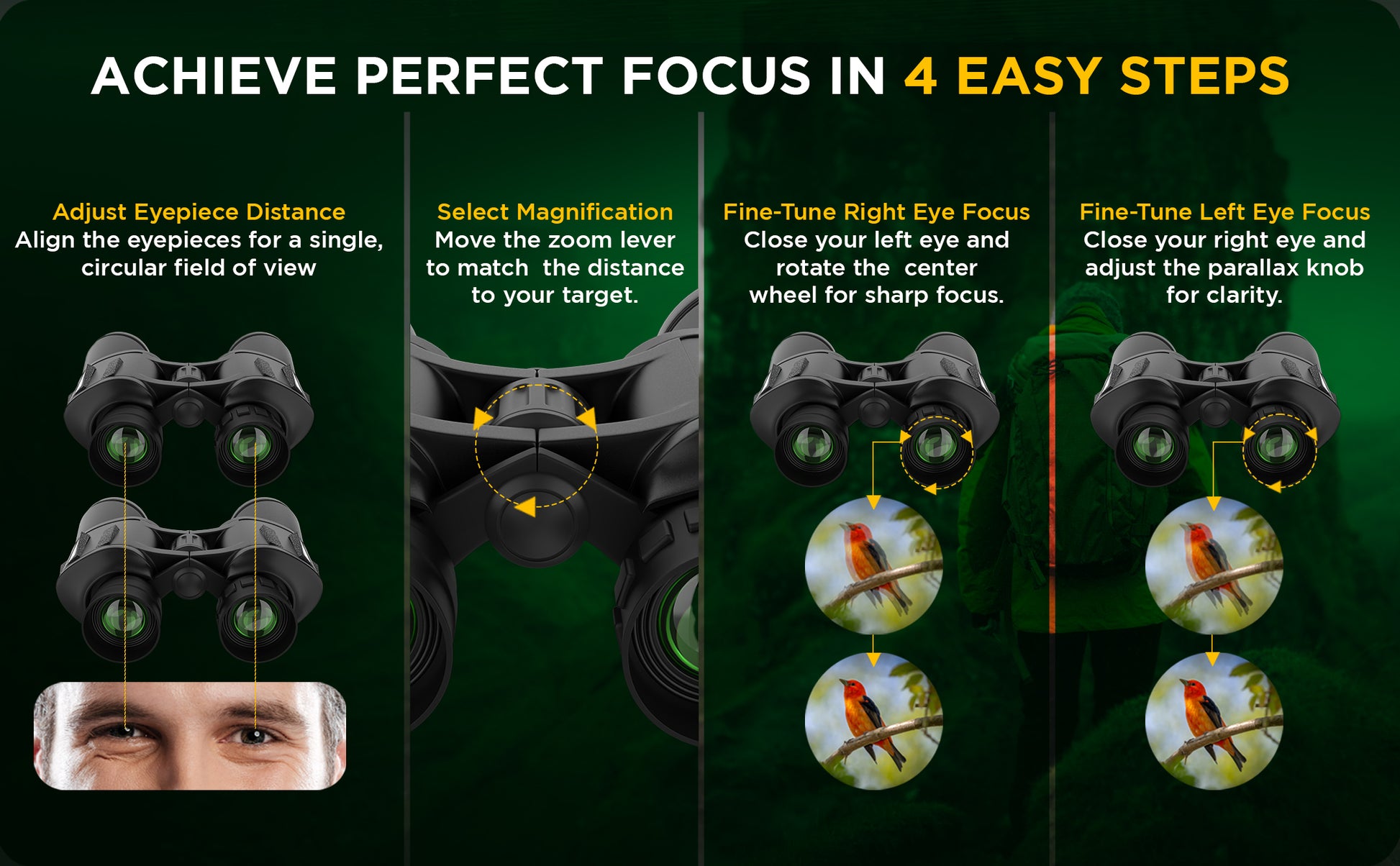 - 【EASY FOCUS BINOCULARS】- Our binoculars 20x50 are perfectly designed to fit both adults and children. They come with adjustable twist-up eyecups, which ensure comfortable viewing whether with or without eyeglasses. The center-focus knob of these compact binoculars guarantees fast and highly precise focusing. Additionally, they can be used with a phone bracket, which ensures a stable camera image when photographing. SAFETY INFORMATION: Do not use these binoculars to look at the intense light or the sun.