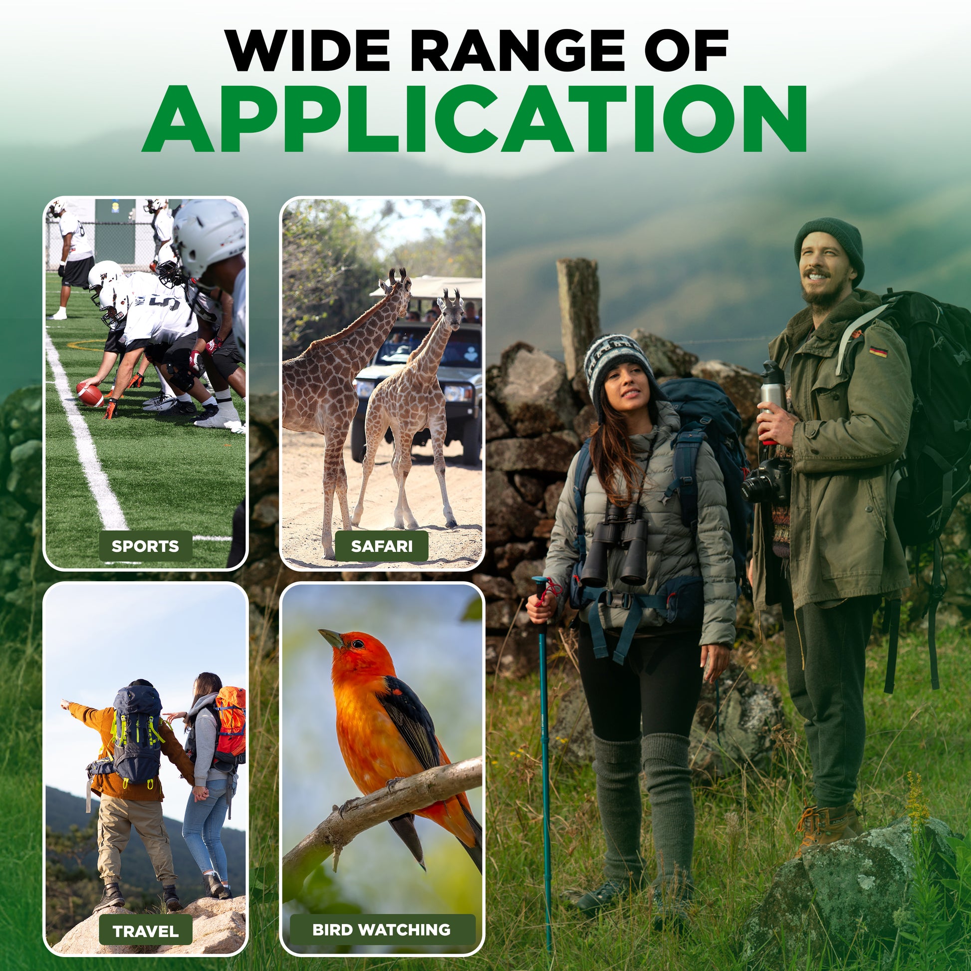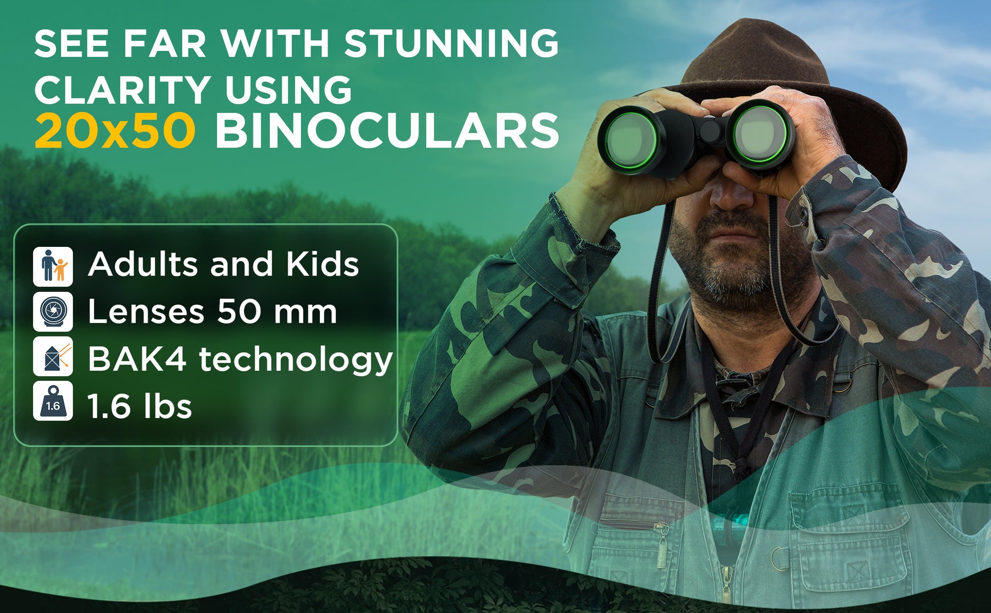 - 【UPGRADED BINOCULARS】- Professional High Powered Binoculars: 20x magnification and 50mm objective lens and 26mm eyepiece size ensure wide-angle viewing from distances of over 1000 yards. These lightweight binoculars, which weigh just 1.6 pounds are perfect for bird watching, hunting, travel, stargazing, concerts, football games, climbing, hiking, driving, observing wildlife, and taking in scenery.