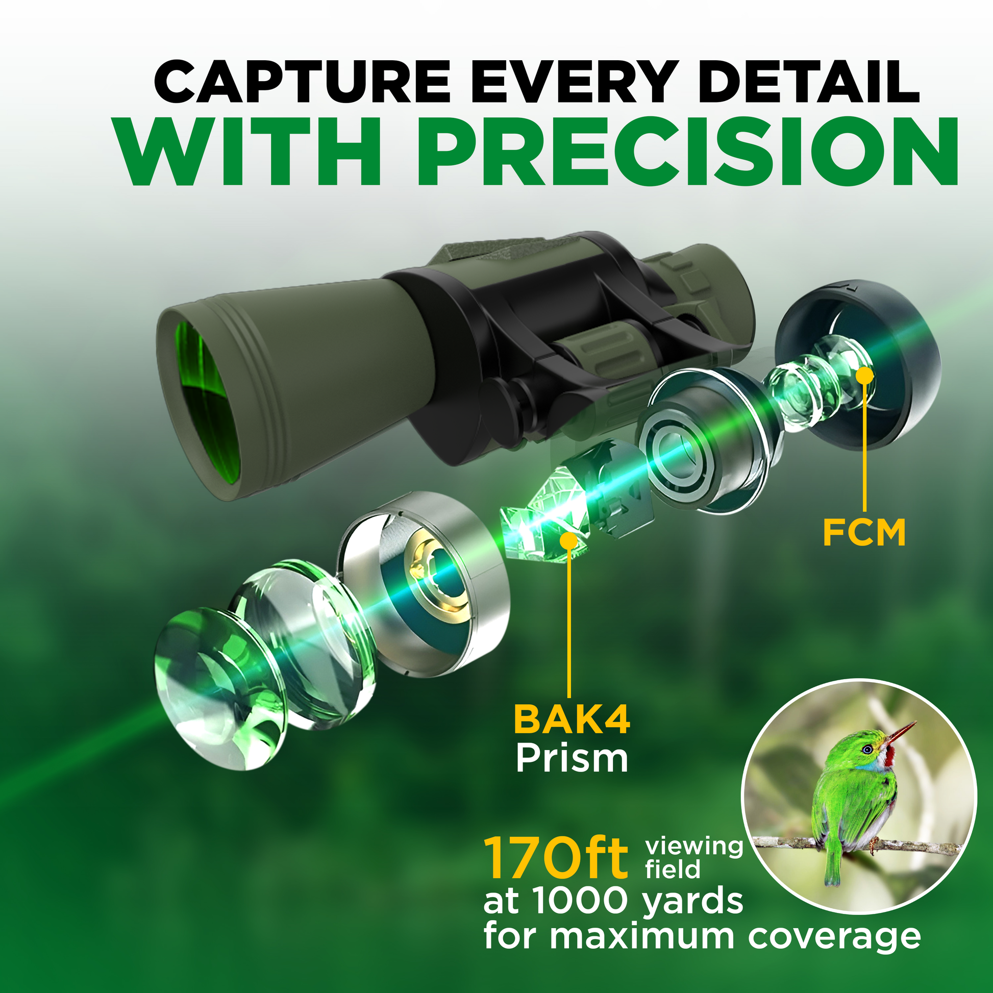 - 【HD ULTRA CLEAR IMAGE】 - These 20x50 binoculars for adults high powered are specially designed with BAK-4 Prisms and FMC film lenses, which minimize the loss of light due to reflection and ensure brighter and clearer high-contrast images. It provides 99.8% light transmission and improves color reproduction. Green FMC anti-reflective coating reduces the reflected light in the objective lens. It enhances light transmission, image brightness, and image sharpness. It will give you an extraordinary using experience.